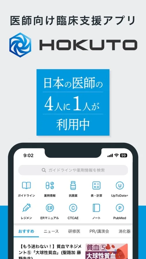 医師向け臨床支援アプリ「HOKUTO」は医師の日々の臨床や情報検索を支援するアプリです。