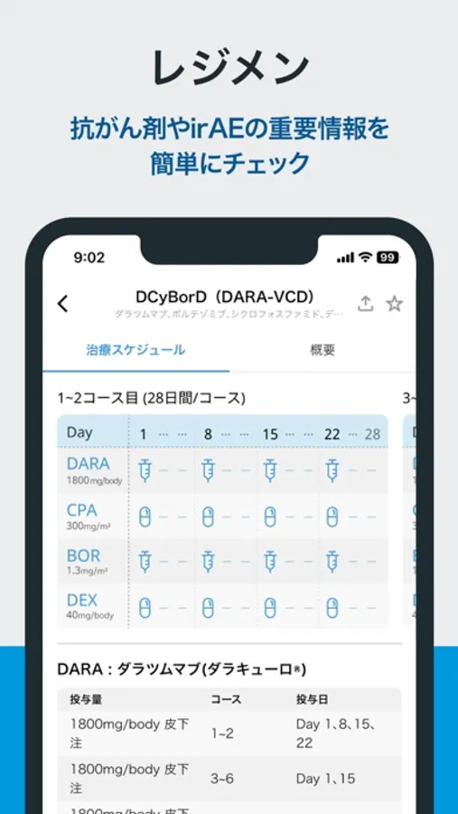 ・レジメン:抗がん剤やirAEの重要情報を簡単にチェック