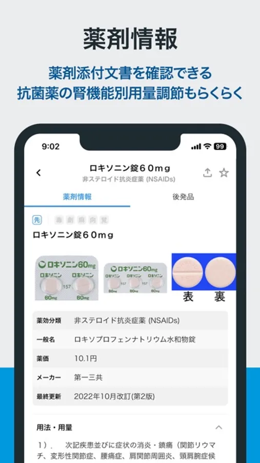 ・薬剤情報:薬剤添付文書を確認できる。抗菌薬の腎機能別用量調整もらくらく