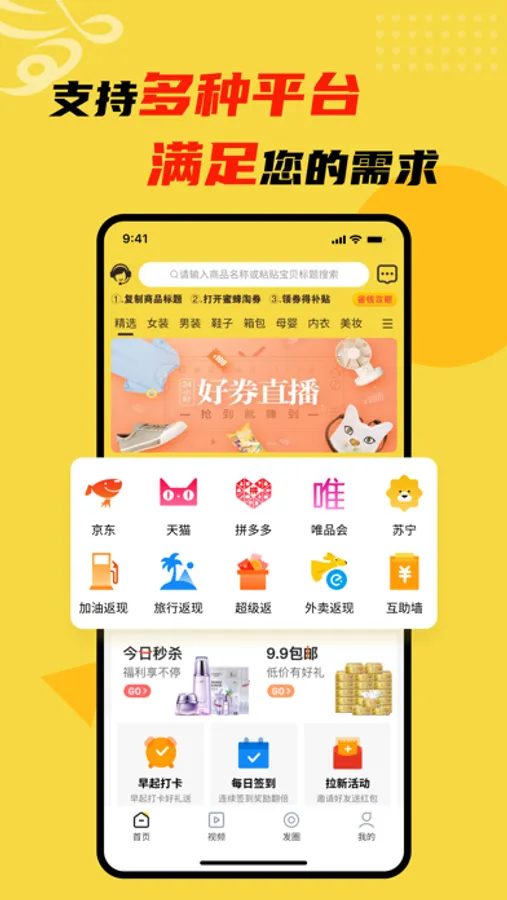 一款汇聚天猫,淘宝,京东,拼多多,唯品会,苏宁为一体的免费购物省钱领券软件。