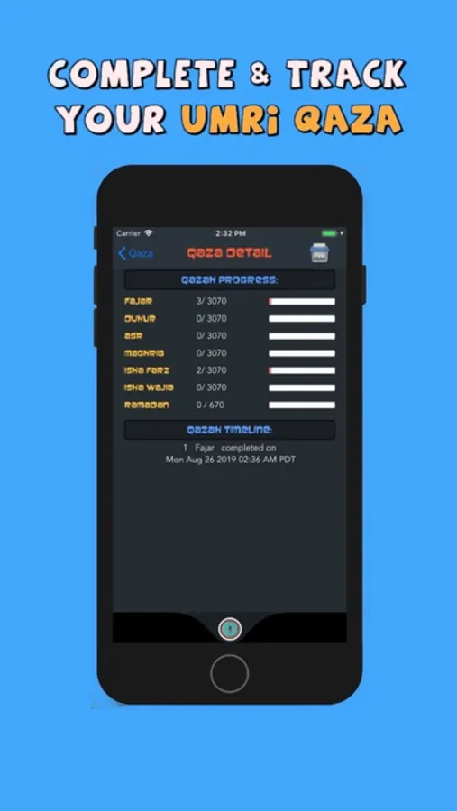 Missed your daily obligatory prayer? With Falaah you can add your missed prayer and track completion whenever you complete them.