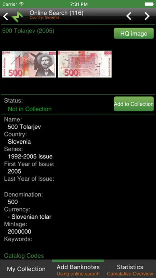 Banknote Mate is an advanced collecting manager for managing your own banknote collection, wishlist, selling lists, etc. Its main advantages are user friendly interface and automatic import (thanks to Colnect API) that will save you a lot of time you would normally spend for manually entering the information. Managing large amount of banknotes has never been so easy.