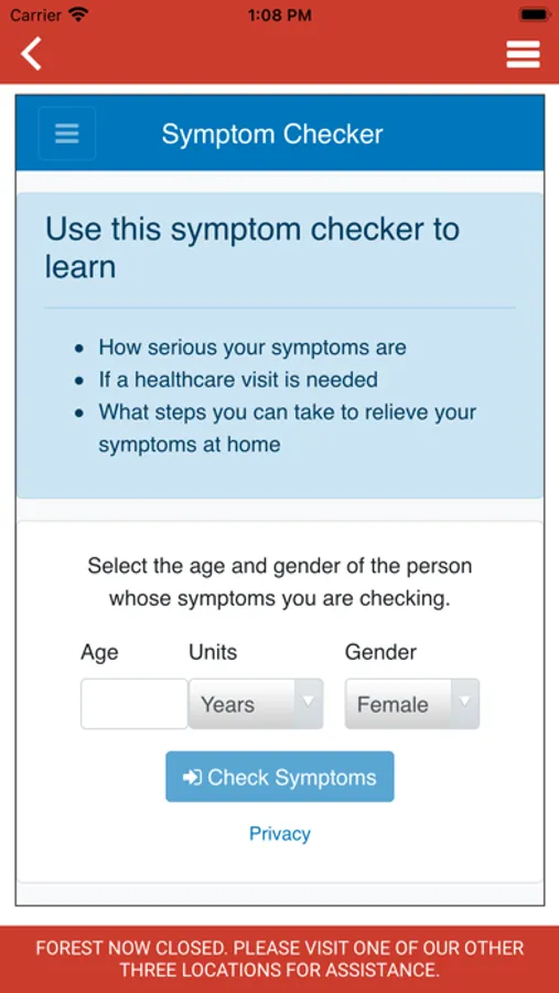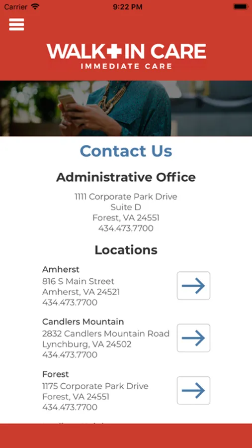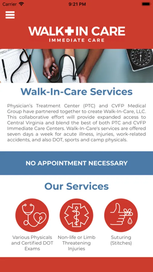 Try Walk-In-Care Immediate Care when you just don't have time to see the regular doctor. Our care facilities are strategically located to help you get care fast! Our app puts everything you need in one place. Whether you want to evaluate your health using our symptom checker or find the nearest location, now you can do it all from the palm of your hand!