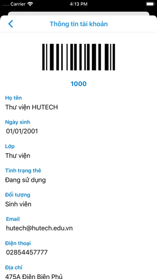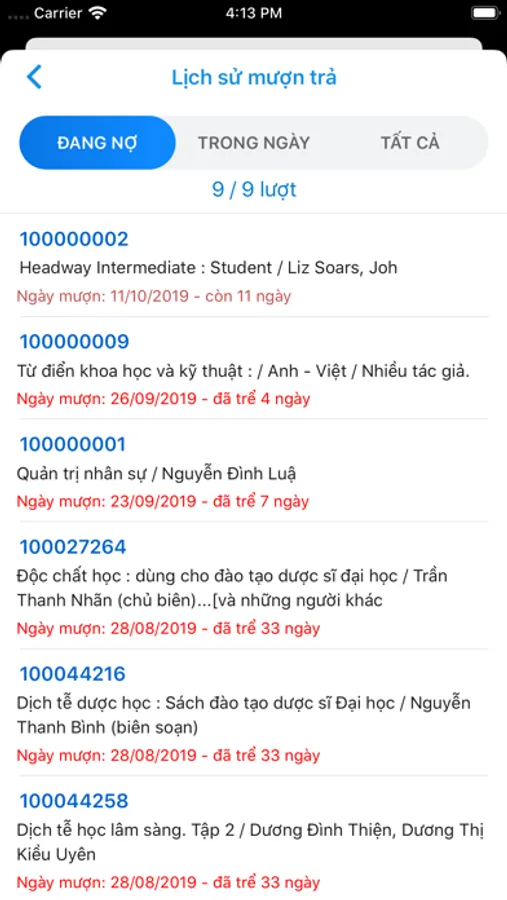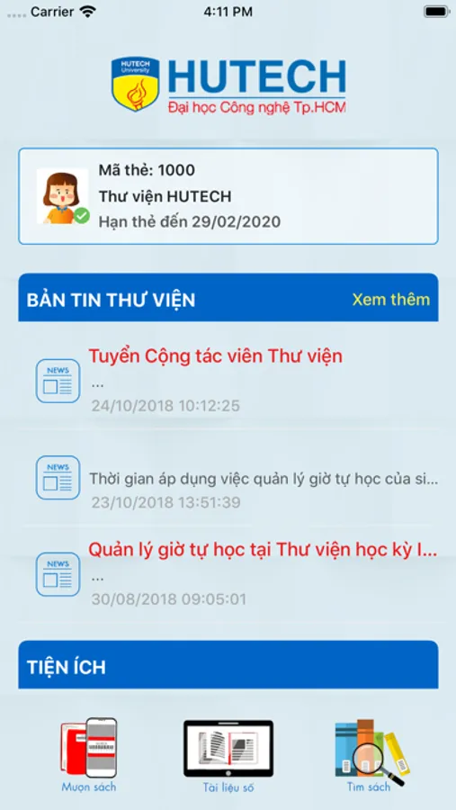 • LỊCH SỬ MƯỢN TRẢ: Theo dõi những cuốn sách nào mà bạn đã, đang mượn và nhắc ngày đáo hạn. Mượn một nơi trả nhiều nơi (thuộc chi nhánh thư viện HUTECH)