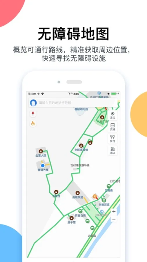 「鄣吴无障碍地图」是一个基于无障碍地图为视障人士、轮椅人士,甚至普通人士提供位置服务的移动应用,通过多种定位技术,让用户了解身处位置及符合己需的环境信息,并导航至目的地。主要功能包括: