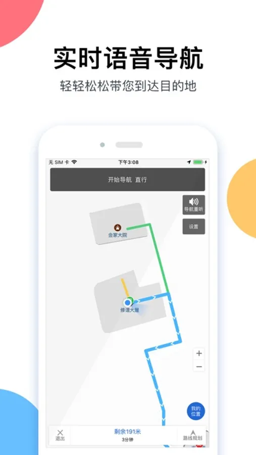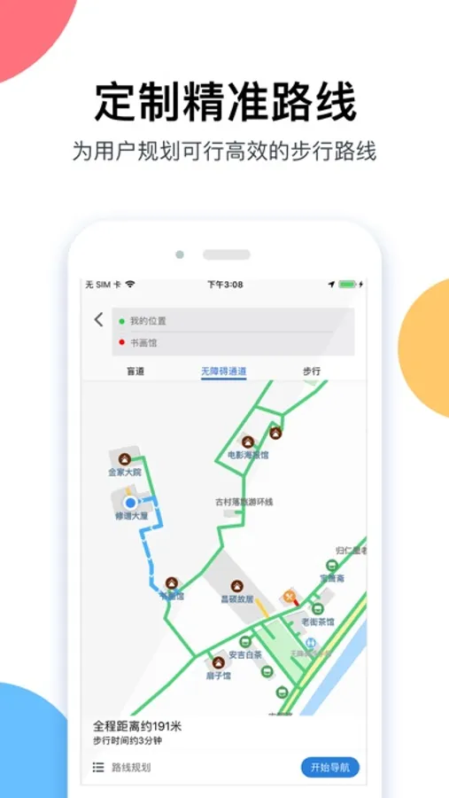 1、室内外定位:显示当前位置;另外轮椅版本还显示轮椅在道路上的通行程度;