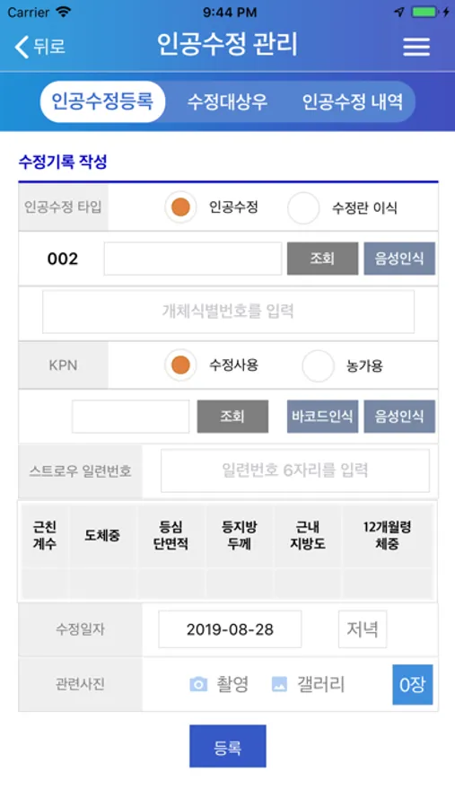 2019년도는 시범사업으로 한우AI앱 및 웹페이지는 한국가축인공수정사협회를 통해 수정사코드를 부여받은 인공수정사에 한하여 회원가입이 가능합니다.