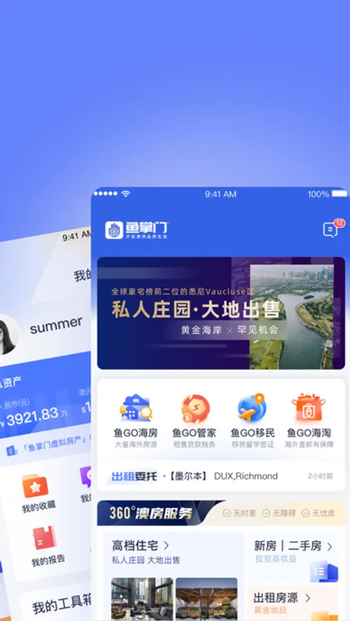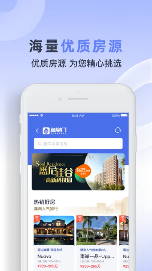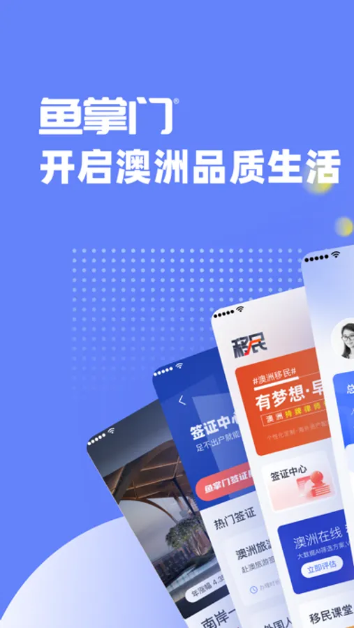 鱼掌门是一款专注澳洲品质生活的平台APP,兼合澳洲房产管理、售后服务、金融服务,澳洲移民、跨境签证,跨境商城以及各类海外资讯为一体的服务型应用。其高品质人性化线上线下服务+互联网应用,旨在为海外投资者和中高端人士提供优质服务。