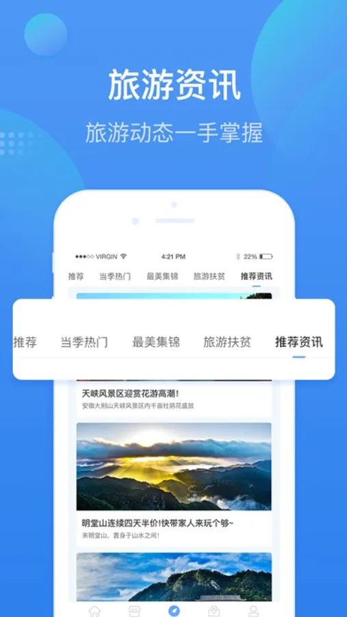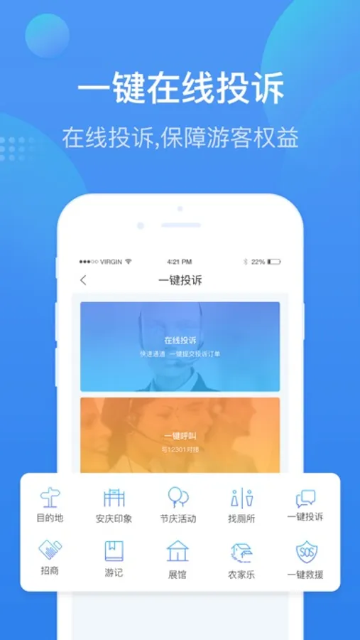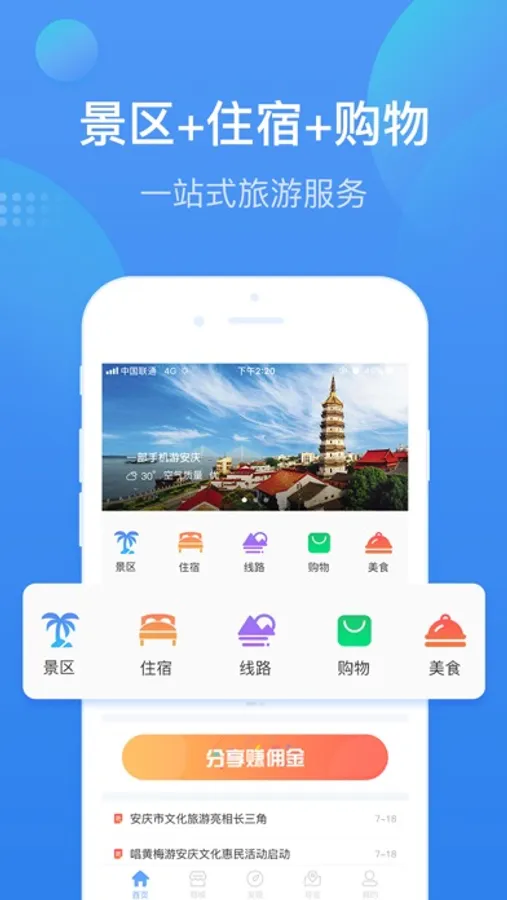 安庆智游App围绕旅游六大要素游:吃、住、行、游、购、娱,为游客提供一站式的旅游服务功能。使用过程中,游客只需登录手机平台,就可享受交通、天气、门票、住宿、特产、线路、美食、投诉等全方位的智慧旅游服务,同时,游客也可以通过APP,掌握本地旅游资源、旅游动态、政务公告、政策法规等旅游资讯。
