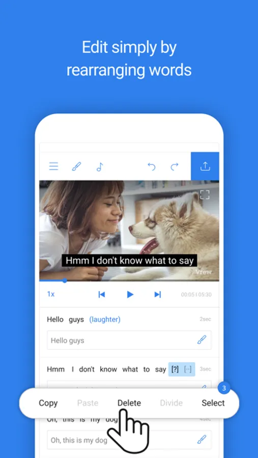 Vrew automatically analyzes speech in the video and it creates a draft of an entire subtitle. Just revise a few typos in your subtitle.