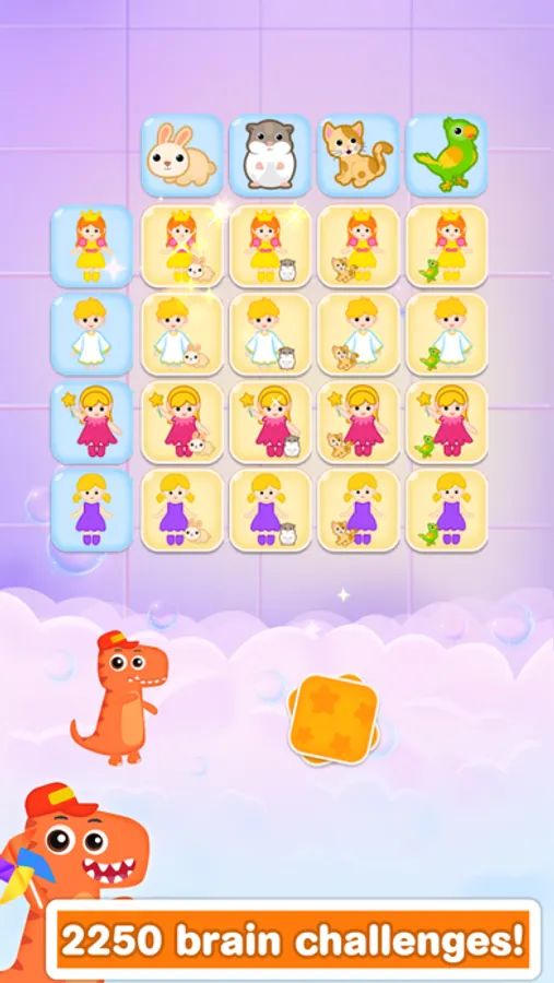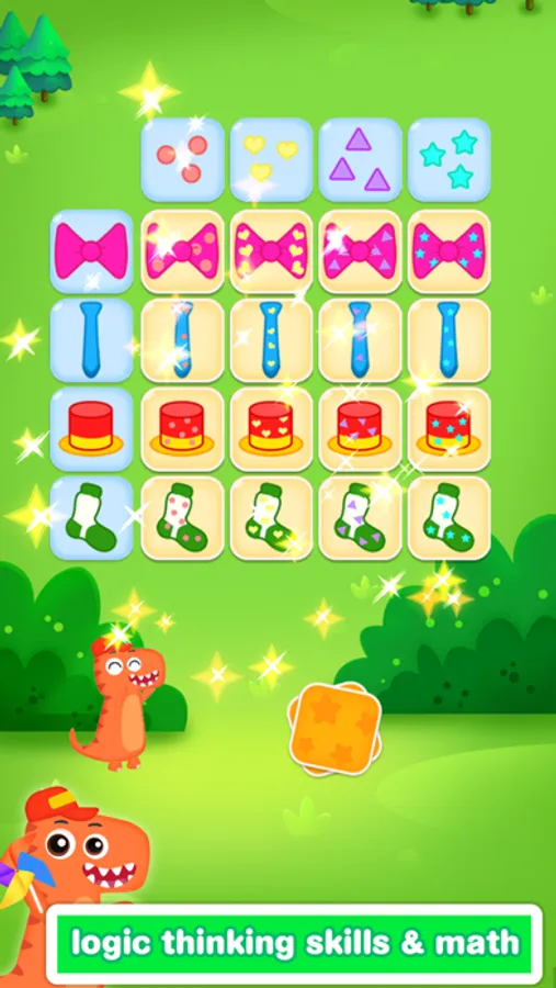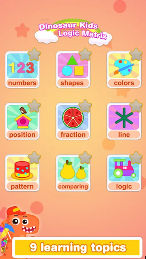 Dinosaur Kids Logic Matrix is an educational app that provides 9 learning categories with 90 levels and 2250 logic puzzles for kids. Select suitable difficulty for kids 3-9: beginner 3x3 grids, novice 4x4 grids, skilled 5x5 grids and expert 6x6 grids.