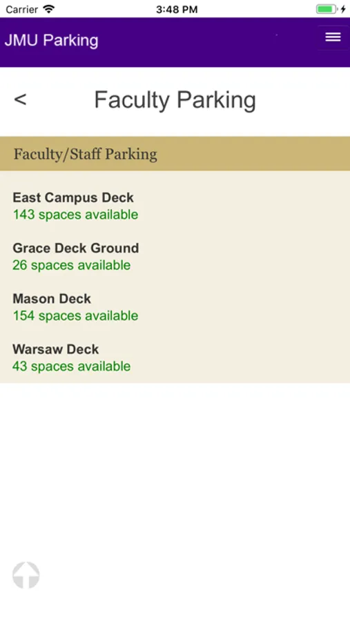 JMU's Parking App provides real-time commuter and faculty/staff parking space availability information for many of the university’s parking decks.