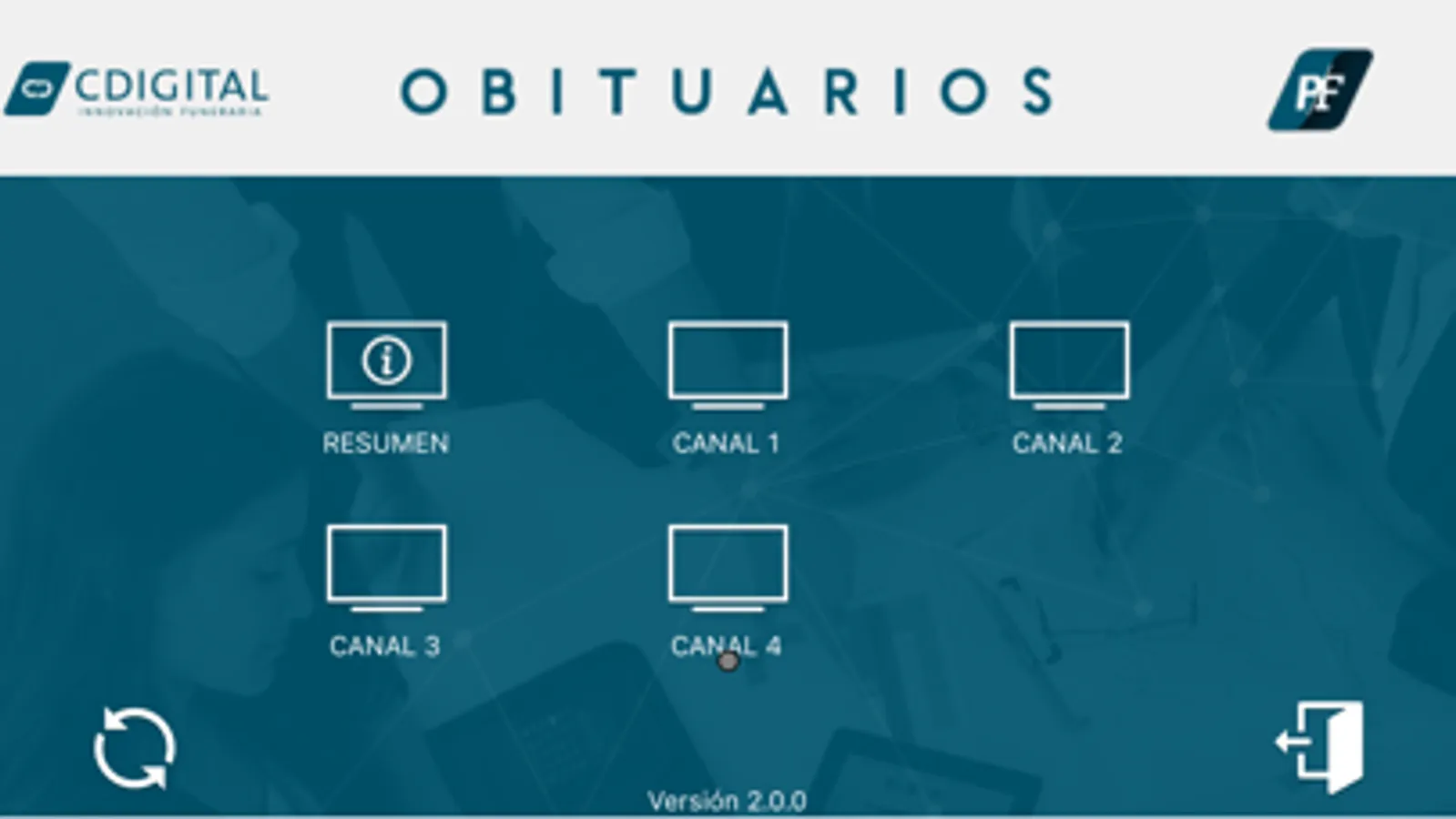 Mejore la imagen de su funeraria y despliegue en pantallas el obituario diario de los servicios que se están llevando a cabo en sus salas de velación. Aplicación que permite vincular una sala de velación a un canal. El contenido del canal Ud. lo programa a su gusto y necesidades, añadiendo su logotipo, publicidad, datos del servicio, imagen del finado, frases e imágenes entre otros.