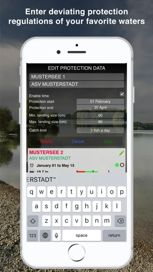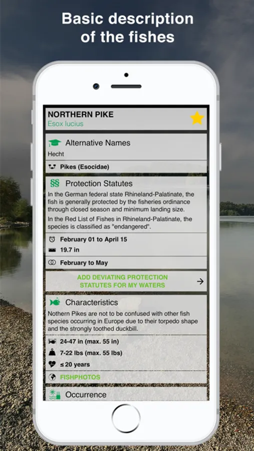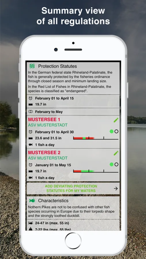 Each fisherman can additionally and individually enter and compile the relevant closed seasons, protection measures as well as catch limits of his target fish. Especially for the waters of own choice, own club, own home water...