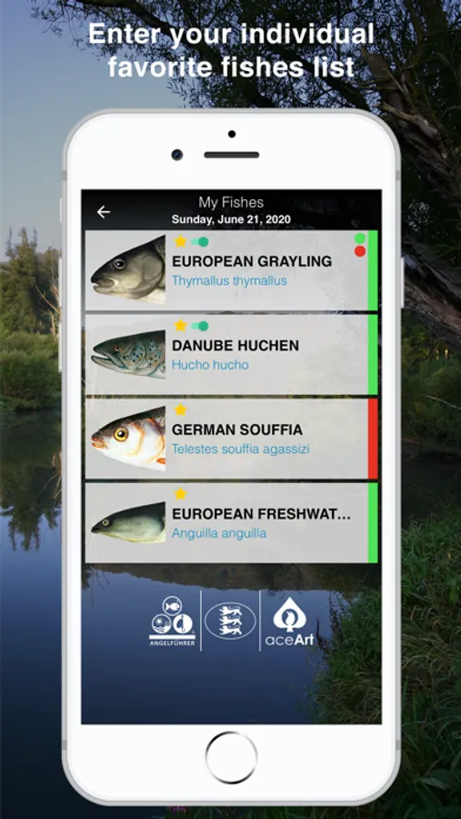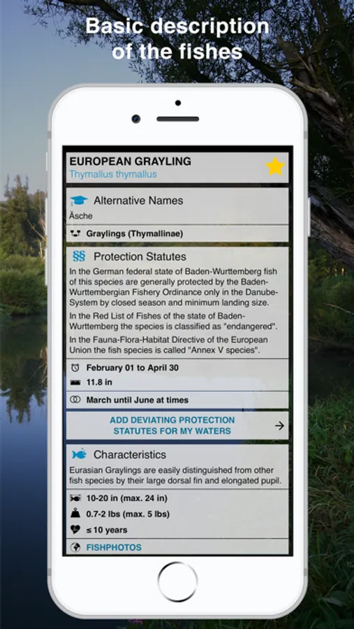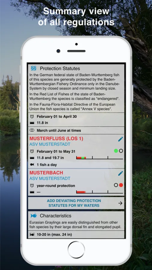 Each fisherman can additionally and individually enter and compile the relevant closed seasons, protection measures as well as catch limits of his target fish. Especially for the waters of own choice, own club, own home water...