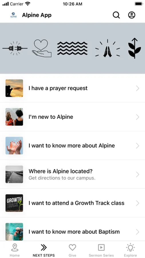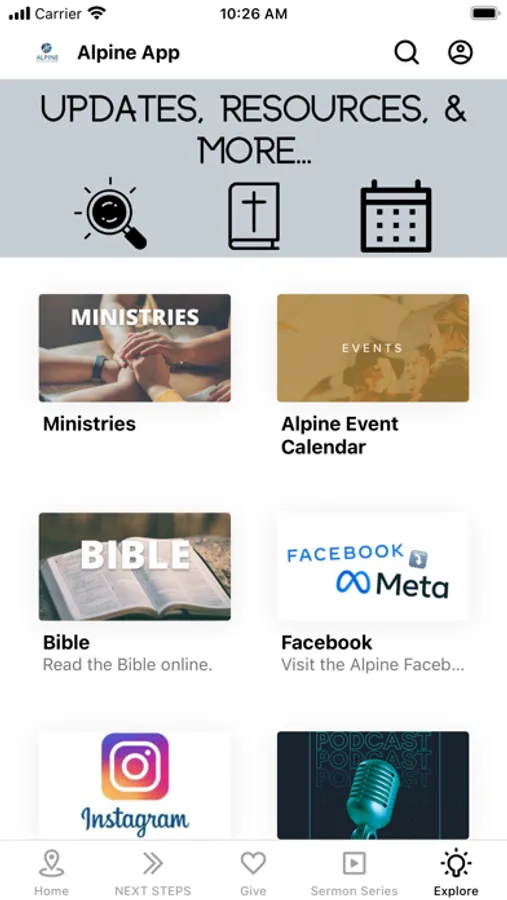 The Alpine App features church life connections such as: Weekly Sermons, Alpine Worship, Upcoming Events, & Online Giving.