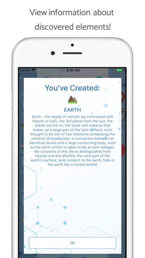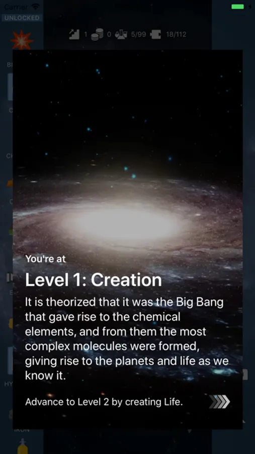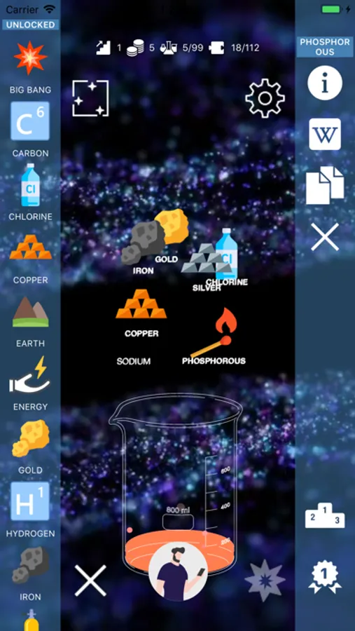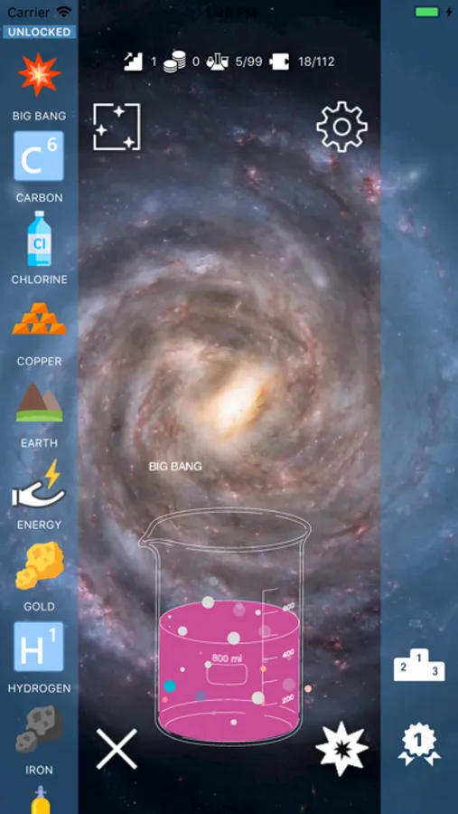 Start with mixtures of basic chemicals (carbon, hydrogen, oxygen, etc.) and discover new compounds and molecules. As you progress through the game, common everyday elements will appear!
