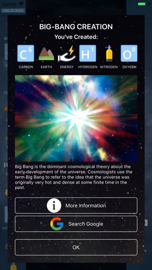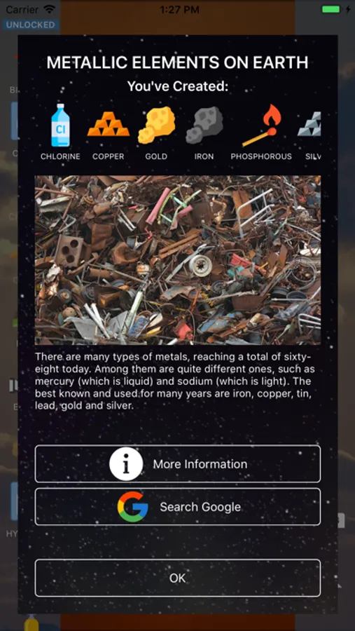 You can see basic information about the discovered elements, as well as the Wikipedia page dedicated to each element. Also, when you successfully complete a reaction, you'll see a dashboard with information about the finished reaction and the products created.