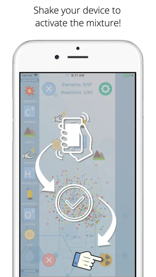 Use the silhouette of the items in the "LOCKED" list to get an idea of what these items are, and how they might be formed. For each successful reaction, the elements created will automatically move from the "LOCKED" to "UNLOCKED" list, from where they can be added to the mixing space with a double tap.