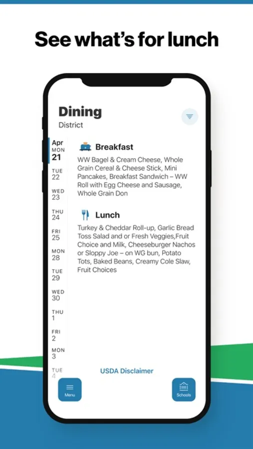 Within the dining section, you'll find an easy to navigate, weekly menu, sorted by day and meal type.