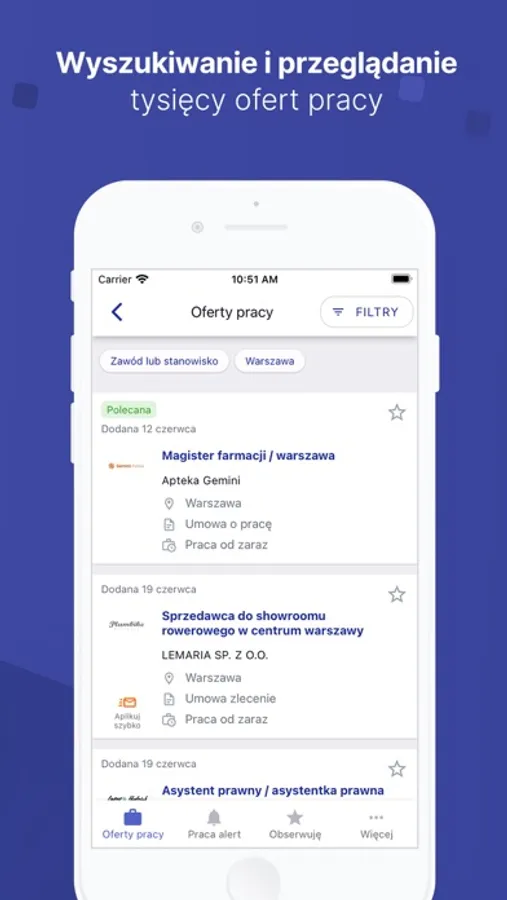 - Wyszukiwanie i przeglądanie ofert – zawsze aktualna lista tysięcy ofert pracy z Twojego regionu i całego kraju;