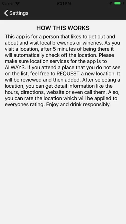 Welcome to Taps And Corks. This app provides a simple way to see all your local breweries and wineries in the Raleigh, Outer Banks and Tidewater area. In order to make this a better app, just request a new place from the settings option. Any place can use this app because it allows for new places to be added all the time. It provides all the details needed for someone to have a good time. The difference is more places can be added at any time without the app having to be updated. It is all data driven. In addition, we have our own rating system for the local places. We have also now included a journal area for you to keep track of what you have purchased along with the cost and counts. More changes are to come.