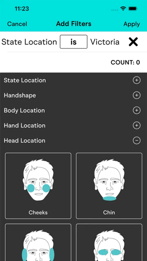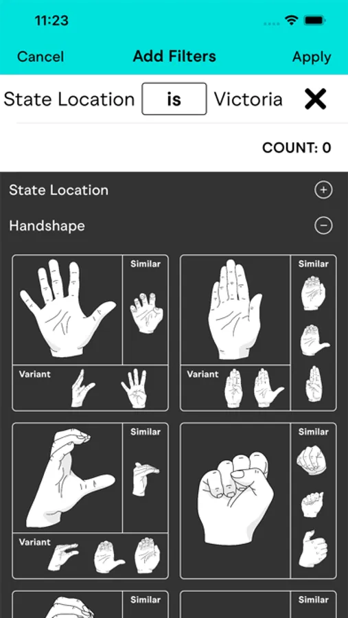 - an improved search mechanism that allows you to search signs by handshape, body location, and state location