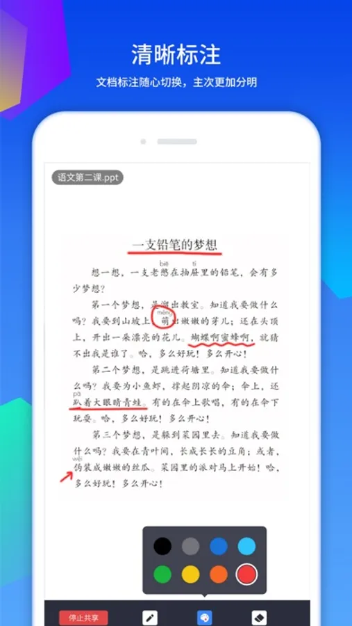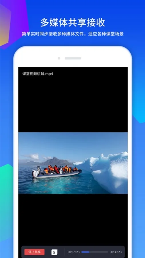 您可以在课堂中共享文档和照片,其他参会人可以立即看到。在看文档时,您还可以看到其他参会人的视频。