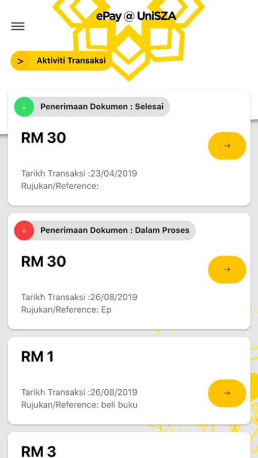 Sebuah aplikasi rasmi ini dibangunkan untuk memudahkan pengurusan pembayaran tanpa tunai di UniSZA melalui telefon pintar selain pembayaran melalui wallet dan transaksi atas talian.