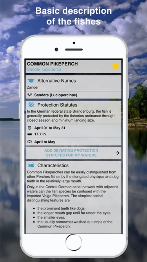 Each fisherman can additionally and individually enter and compile the relevant closed seasons, protection measures as well as catch limits of his target fish. Especially for the waters of own choice, own club, own home water...