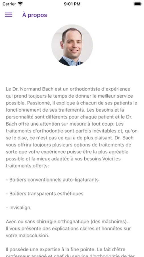 Cette application est un outil indispensable pour les patients actuels et les futurs patients de Dr Normand Bach, orthodontiste à Montréal. Elle est utile tant pour communiquer directement et efficacement avec lui que pour lui envoyer les photos afin qu’il vous donne son opinion SANS FRAIS sur la durée, le coût et le type de broches que vous pouvez avoir ou si vous êtes éligibles à un traitement par gouttières transparentes Invisalign.