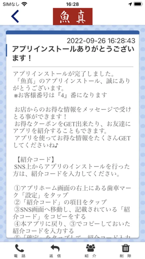 魚真のアプリをSNSを通じてお友達に紹介する事ができます。