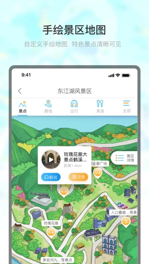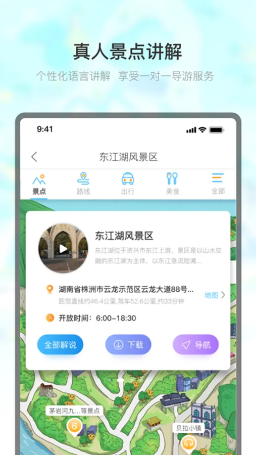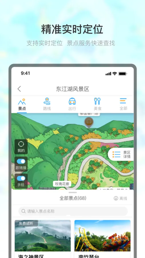 整合全国上万景区,根据定位自动播放景区语音讲解,让您轻松了解游玩景区的历史文化;针对每个景区,官方推荐游玩线路,满足不同游玩需求;精美手绘地图配上精准定位,让您轻松掌控景区地图,不再迷路。