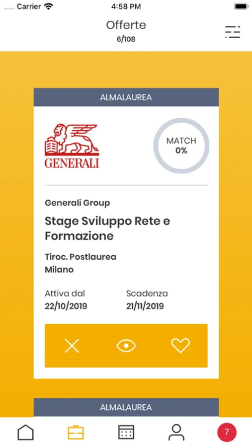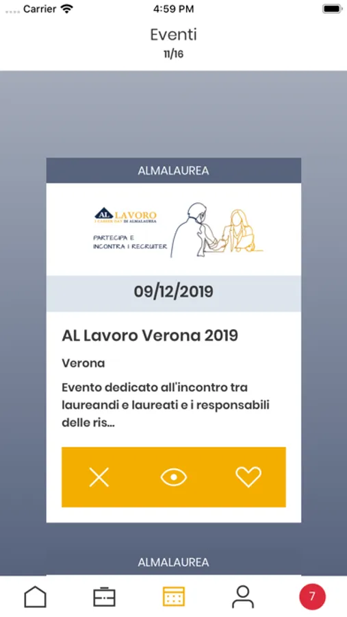 - salvare le offerte di lavoro e gli eventi che ti interessano con uno swipe right o ignorarle con uno swipe left;