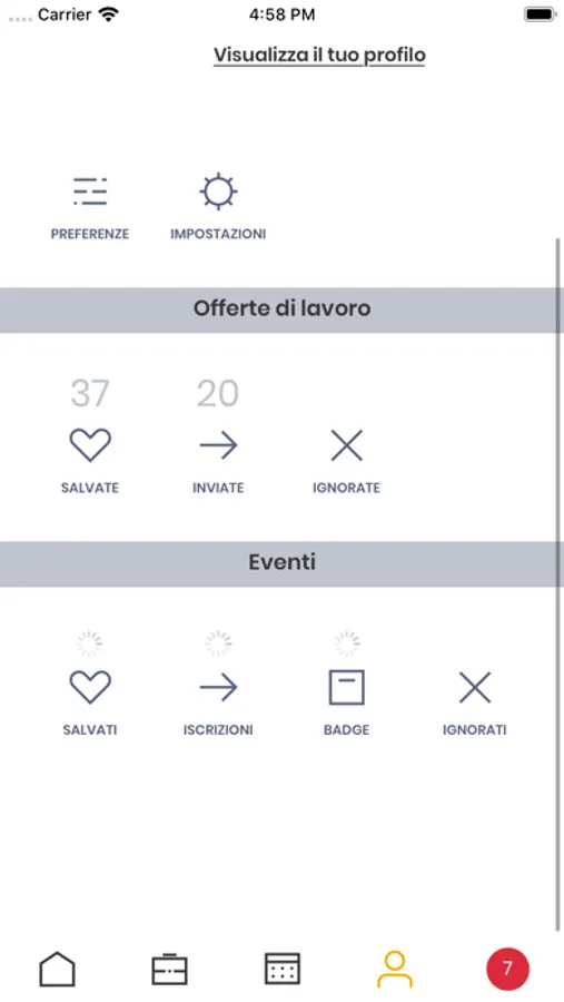 - verificare nella dashboard le offerte e gli eventi salvati, ignorati e quelli a cui ti sei candidato e registrato;