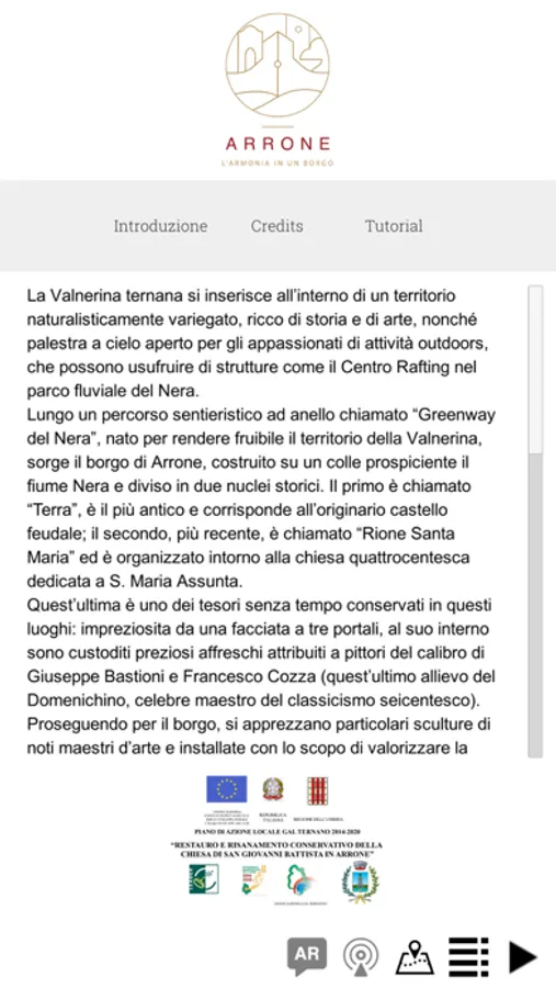 “Arrone – l’armonia in un borgo” è una applicazione che sfrutta le funzioni dell’Augmented Reality e del Bluetooth per dare al turista una esperienza unica e coinvolgente di visita del patrimonio artistico del borgo di Arrone. E’ sufficiente scaricare l’APP dallo store, concedere le autorizzazioni ed accendere il Bluetooth dello smartphone. Durante la vostra visita l’APP rileverà i sensori ibeacon presenti in prossimità dei punti di interesse, che attiveranno automaticamente l’audioguida ed apriranno la scheda descrittiva del monumento. Il visitatore inoltre all’interno della chiesa di San Giovanni Battista potrà sfruttare anche la Realtà Aumentata, puntando la fotocamera del dispositivo su alcuni affreschi: in questo modo sarà possibile osservare ricostruzioni ed informazioni aggiuntive direttamente sui dipinti; successivamente basterà abbassare la fotocamera per accedere automaticamente al contenuto della sua scheda descrittiva ed alla audioguida. Puntando la fotocamera verso un altro affresco sarà possibile effettuare altre esperienze.