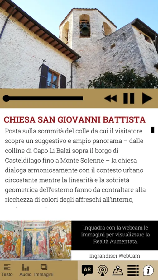 L'esperienze della Realtà Aumentata è visibile solo visitando la chiesa ma avete a disposizione un menu di navigazione per poter visualizzare tutte le schede ed i contenuti presenti nell'applicazione.