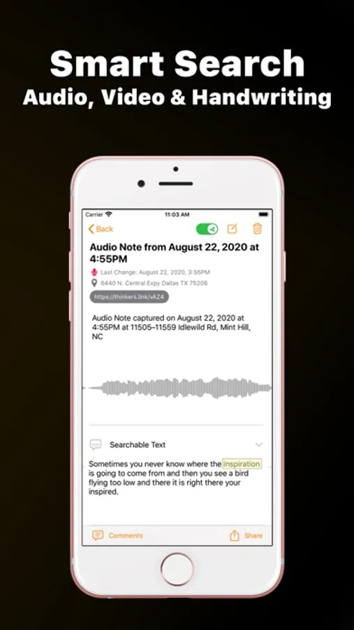 Our unique machine learning technology automatically recognizes handwriting so words on a notebook page or whiteboards can be searched in the app. Plus, audio and video notes are automatically transcribed so you can find what was said.