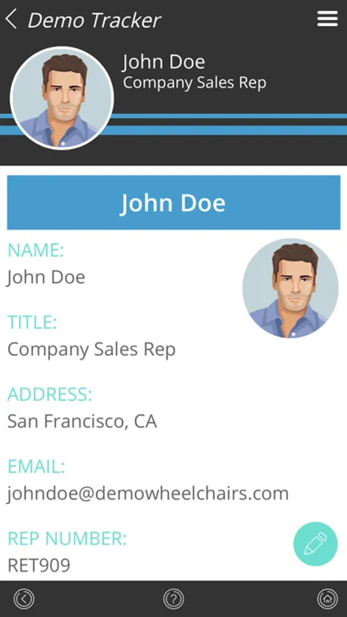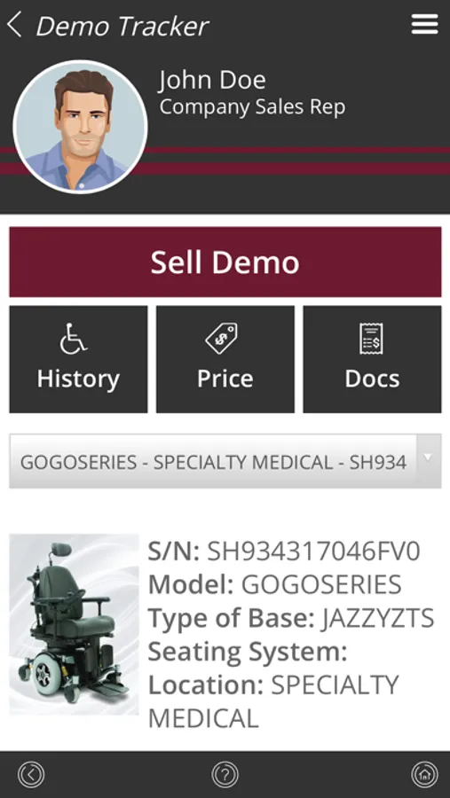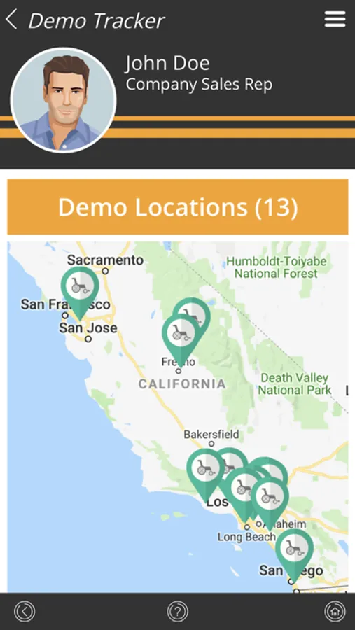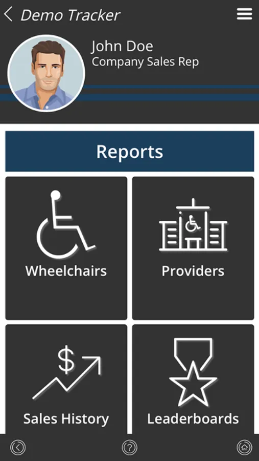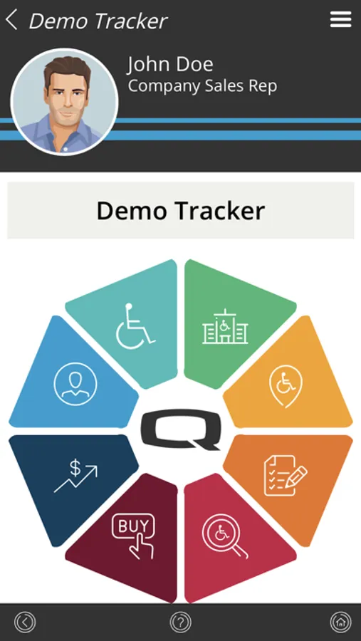 To use this app, sales reps start with the light-blue panel (9:00 o’clock position), then advance clockwise around the “Demo Tracker” main menu to use each of the primary features.
