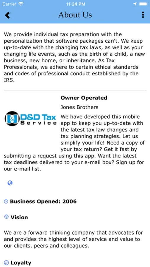 We provide individual tax preparation with the personalization that software packages can't. We keep up-to-date with the changing tax laws, as well as your changing life events, such as the birth of a child, a new business, new home, or inheritance. As Tax Professionals, we adhere to certain ethical standards and codes of professional conduct established by the IRS. We have developed this mobile app to keep you up-to-date with the latest tax law changes and tax planning strategies. Let us simplify your life! Need a copy of your tax return? Get it fast by submitting a request using this app. Want the latest tax deadlines delivered to your mobile phone? Download our app for easy access to us year-round!