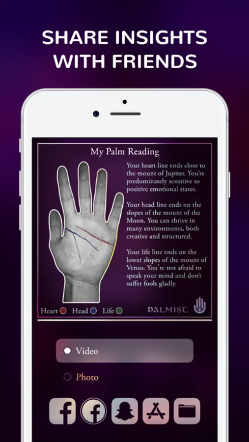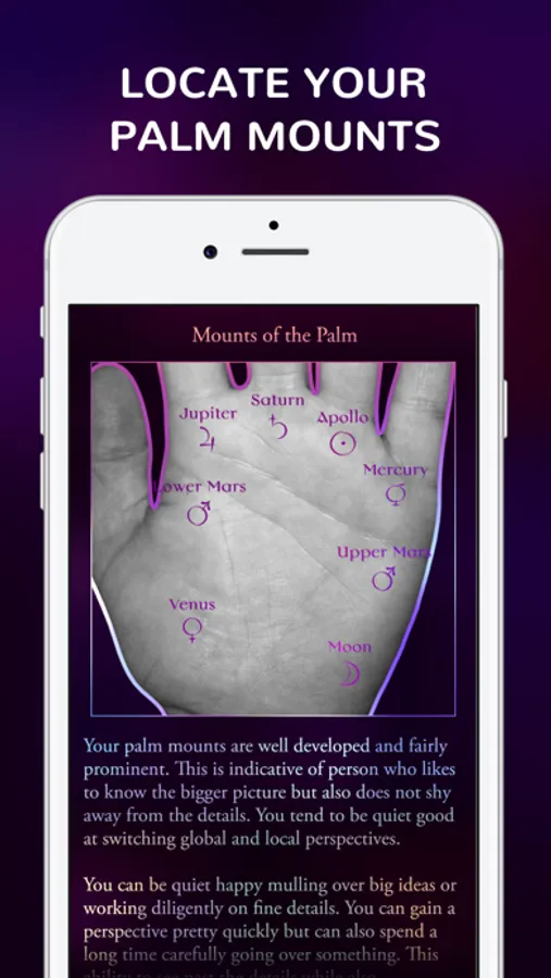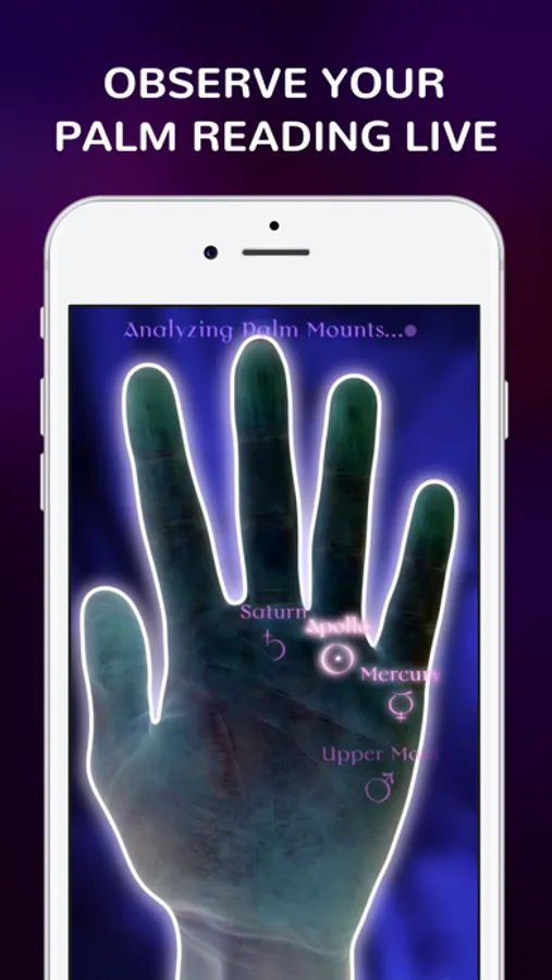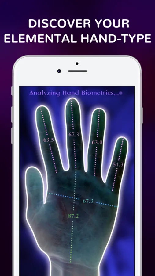 Palmist uses advanced augmented reality to analyse your palm in real time. All the analysis is presented to you live; you can see for yourself the detection of your palm and your three major lines (life, heart and head), your elemental hand type (Earth, Fire, Air or Water), your mount locations and many other critical palmistry features. A personalised reading based on your individual palm characteristics is given to you after the analysis. The reading takes into account not only palmistry folklore but also scientific characteristics, such as your index and ring finger length ratios (known as the 2D/4D ratio). Palmist pays particular attention to palm-derived personality traits, and what they can tell you about yourself and your possible future trajectories.