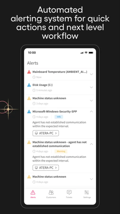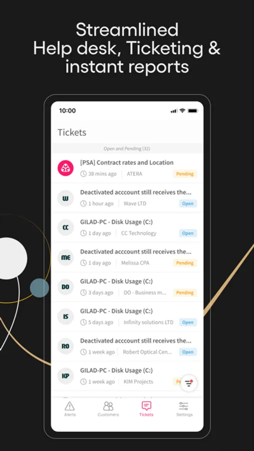 Introducing the Atera mobile app! Provide awesome IT support to your customers, at the office, on-site, and on-the-go, with alert monitoring, access to customers, contacts and devices, remote access, and more.
