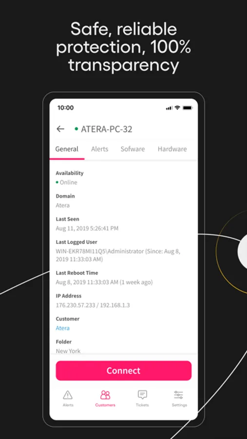 Atera is a unique platform designed for Managed Service Providers (MSPs) and internal IT departments; Combining Remote Monitoring and Management (RMM), Help Desk, Remote Support, Billing and Reporting —it’s a complete, one-stop-shop that enables MSPs to manage their entire business. The mobile app is a lite version designed to be used alongside Atera software.