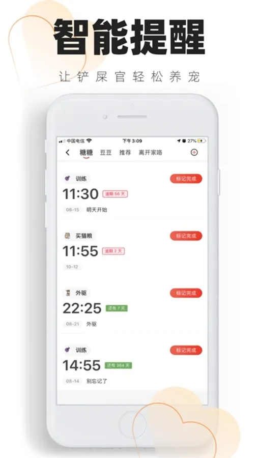 您可以设定日常提醒计划,包括给宠物铲屎、注射宠物疫苗、宠物驱虫、宠物洗澡、宠物剪指甲等等几十种宠物常用的提醒,当然您也可以自定义提醒内容,非常人性化。