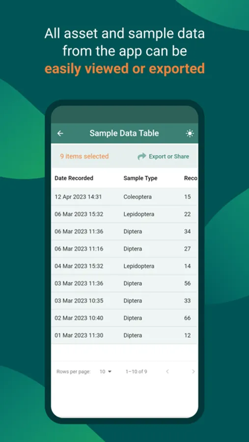You can easily export/share data to Google Drive, email, SMS, etc., and you can switch between light and dark modes to account for day or night time conditions.