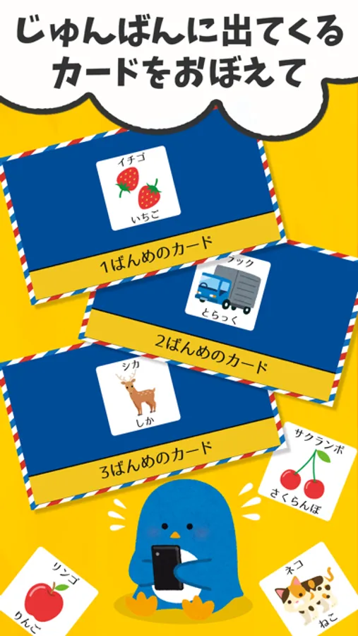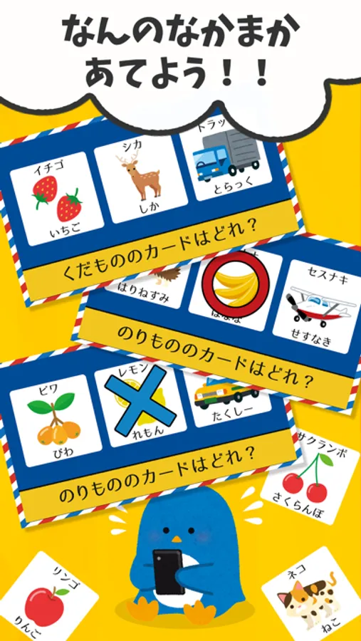 2.カードが3枚流れてきたあとに、全てのカードが同時に並び「○○(どうぶつ・くだもの・のりもの)のカードはどれ?」という質問が出されるので、お題に合ったカードを選びタップしましょう!