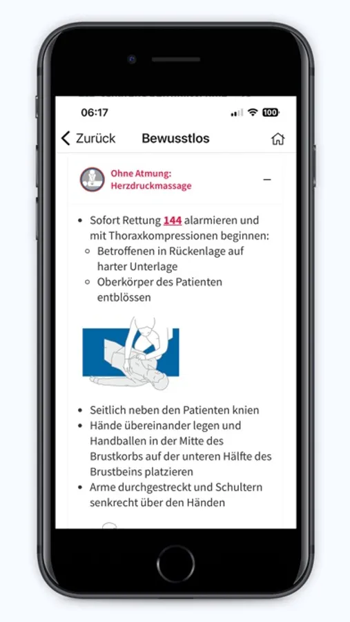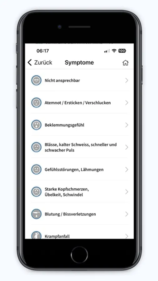 • Situative Anleitungen zu Notfall-Symptomen (Text, Grafik und Ton) für ERSTE HILFE