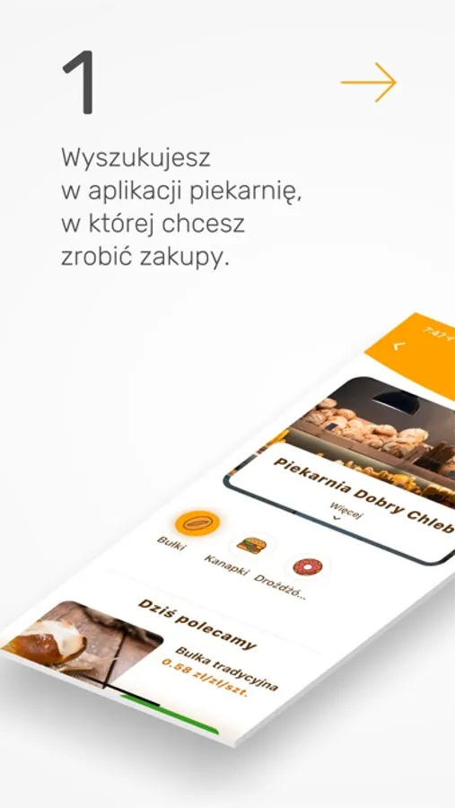 Krok 1: Wyszukujesz w aplikacji piekarnię, w której chcesz zrobić zakupy.