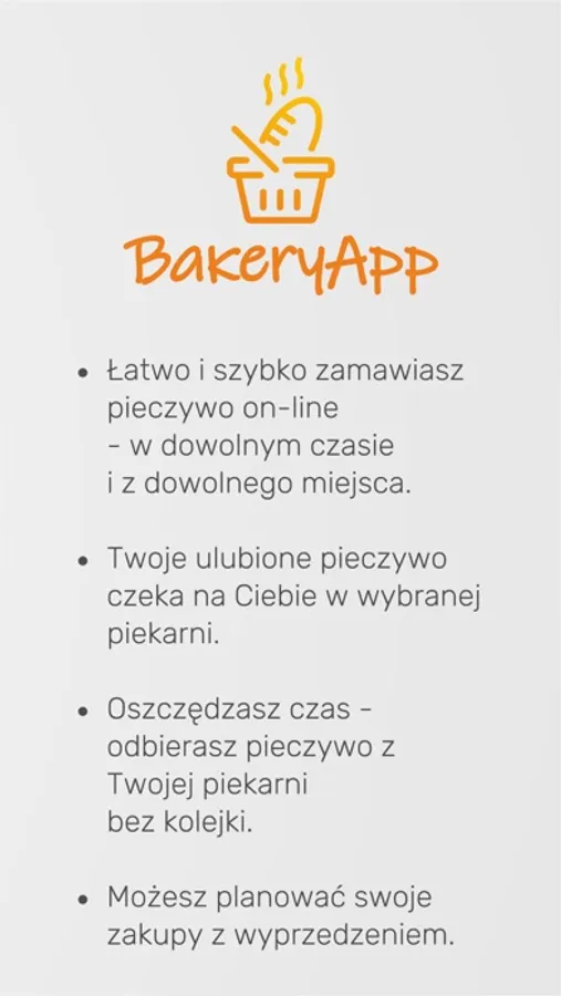 BakeryApp to aplikacja, dzięki której o dowolnej porze i z dowolnego miejsca zamawiasz swoje ulubione pieczywo on-line i odbierasz je w piekarni wtedy, kiedy jest Ci najwygodniej. Znajdź Twoją ulubioną piekarnię, przejrzyj jej ofertę produktową i aktualne promocje, a następnie zamów Twoje ulubione pieczywo – za zakupy zapłać on-line i odbierz je w dogodnym dla Ciebie terminie.