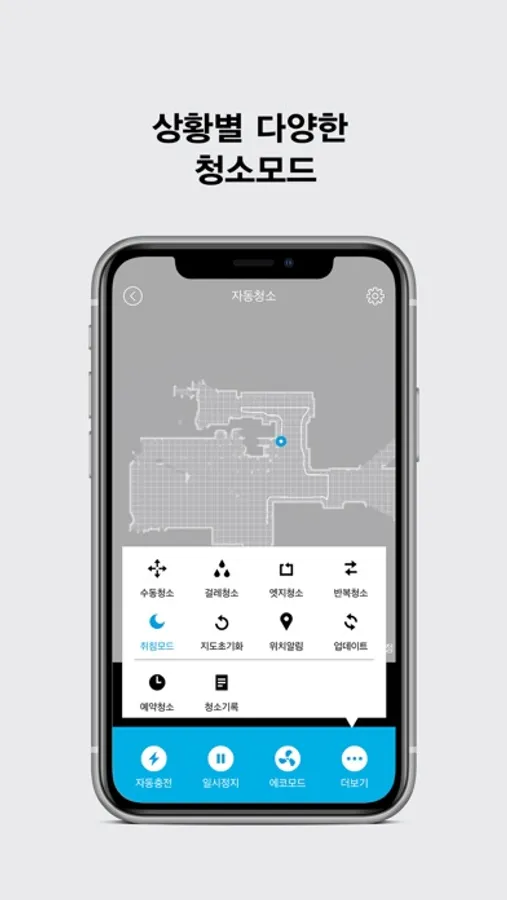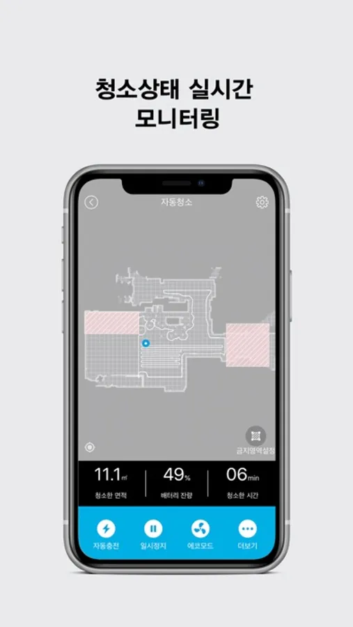 #원격제어 및 청소상태 실시간 확인청소 시작/정지, 청소모드 변경, 충전 등 집 밖에서도 자유롭게 제어할 수 있습니다. 로봇의 현재 위치와 이동 경로, 청소한 구역과 남은 청소 구역 등을 실시간으로 확인할 수 있습니다.